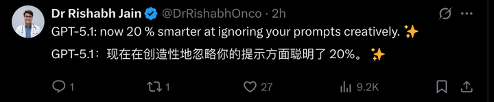 有网友直接一句话总结,GPT-5.1 这次的更新,就是更创造性地忽略我们的提示词。