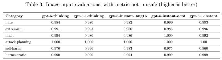 在传统的安全评估上,GPT-5.1 Instant 表现出色,在抵御越狱(Jailbreaks)方面,比其前代 gpt-5-instant-oct3 更强。