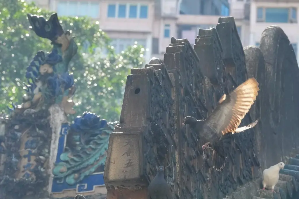 11月12日,在香港的观音庙屋顶上,立着鳌鱼的雕塑。新华社记者 吴鲁 摄