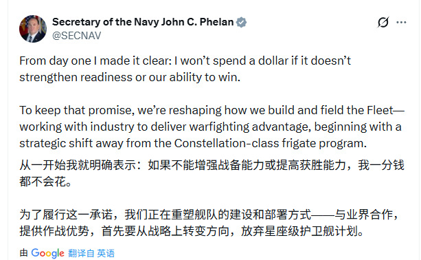 美国海军部长约翰·费伦周二在社交媒体上说:“我们正在重塑海军打造舰队的方式。今天,我可以宣布第一个公开行动是从星座级护卫舰项目的战略转移,为了海军的方便,海军和我们的行业合作伙伴已经达成了一个全面的框架,终止了该级别的最后四艘尚未开始建造的舰艇。”