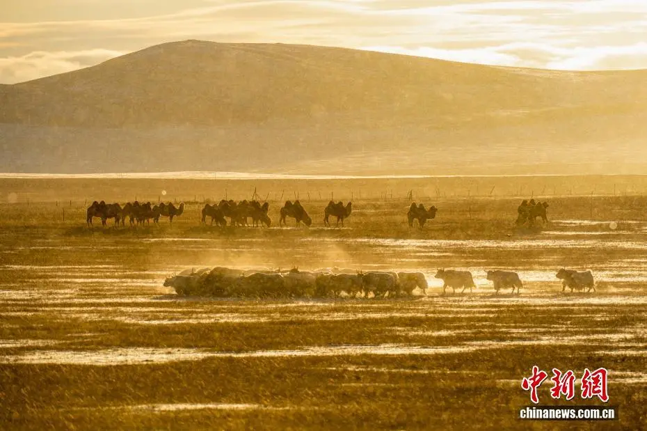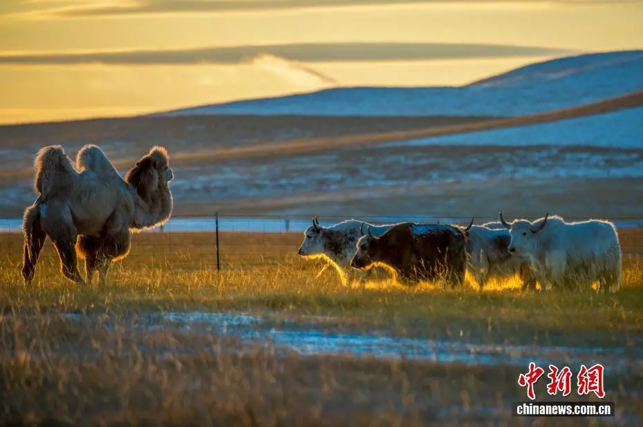近日,内蒙古自治区锡林郭勒盟锡林浩特迎来入冬后的首场降雪。落日时分,余晖洒落,漫天雪花如碎金般飞舞,茫茫草原覆上一层薄白。骆驼群沉稳徜徉,牦牛群悠闲食草。夕阳中,它们的身影被镀上一层温暖金边。图为闲适的骆驼和牦牛。崔巍光 摄