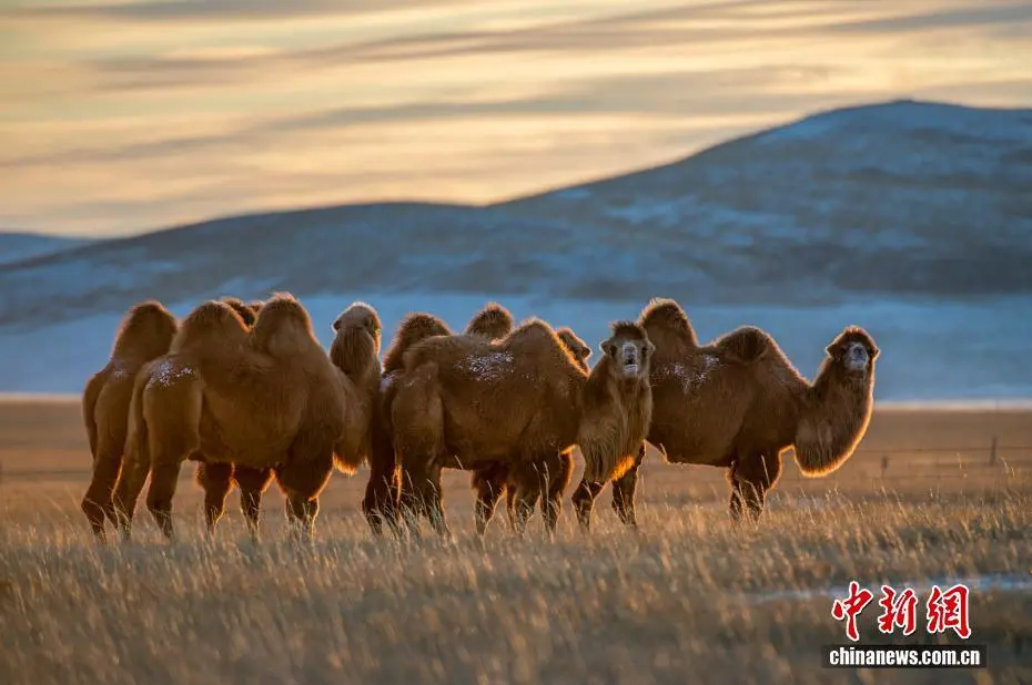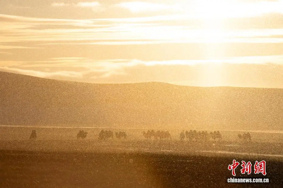近日,内蒙古自治区锡林郭勒盟锡林浩特迎来入冬后的首场降雪。落日时分,余晖洒落,漫天雪花如碎金般飞舞,茫茫草原覆上一层薄白。骆驼群沉稳徜徉,牦牛群悠闲食草。夕阳中,它们的身影被镀上一层温暖金边。图为夕阳下的驼群。崔巍光 摄