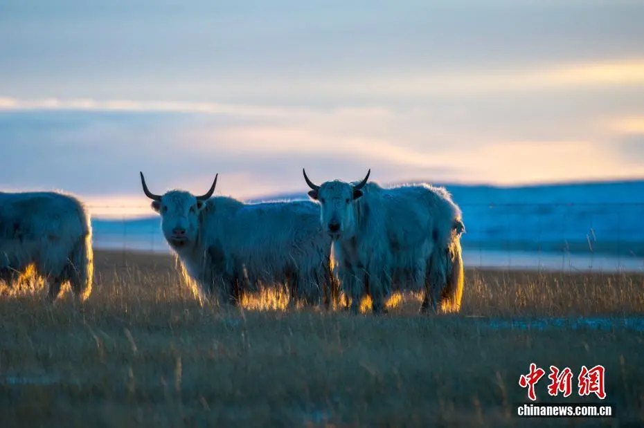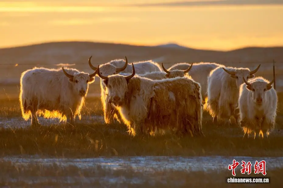 近日,内蒙古自治区锡林郭勒盟锡林浩特迎来入冬后的首场降雪。落日时分,余晖洒落,漫天雪花如碎金般飞舞,茫茫草原覆上一层薄白。骆驼群沉稳徜徉,牦牛群悠闲食草。夕阳中,它们的身影被镀上一层温暖金边。图为牦牛被夕阳“镶”上金边。崔巍光 摄