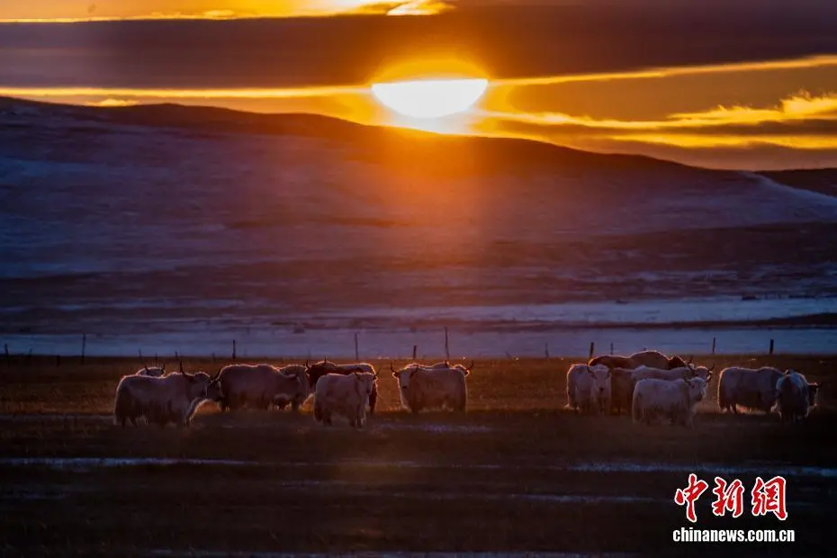 近日,内蒙古自治区锡林郭勒盟锡林浩特迎来入冬后的首场降雪。落日时分,余晖洒落,漫天雪花如碎金般飞舞,茫茫草原覆上一层薄白。骆驼群沉稳徜徉,牦牛群悠闲食草。夕阳中,它们的身影被镀上一层温暖金边。图为夕阳下的牦牛群。王志伟 摄