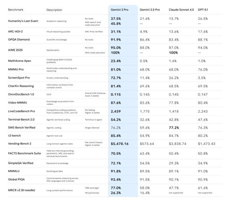 -推理能力:官方强调 Gemini 3 Pro 在 Humanity’s Last Exam、GPQA Diamond、MathArena 等一堆高难度推理和数学基准上,全部刷出了新高分,定位就是「博士级推理模型」。