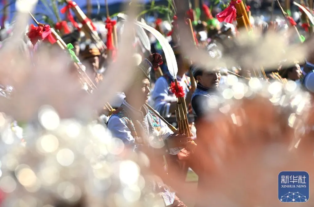 ↑11月29日,表演者在融水县民族体育公园举行的芦笙斗马节开幕式现场吹奏芦笙。新华社记者 黄孝邦 摄