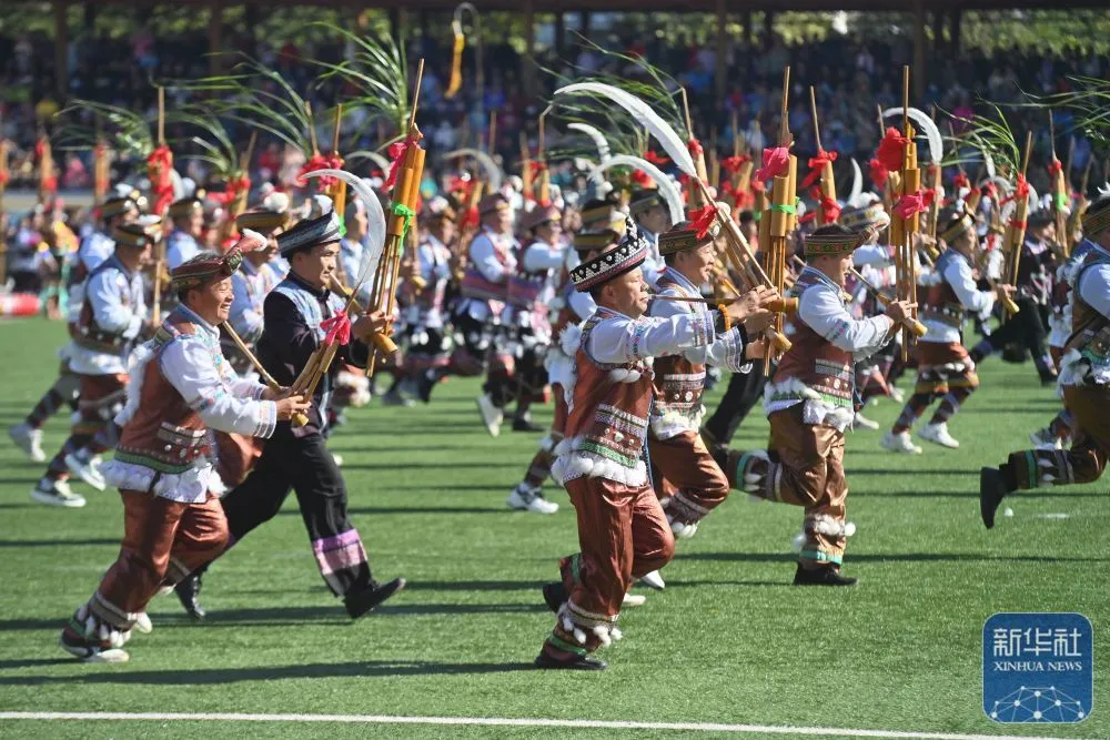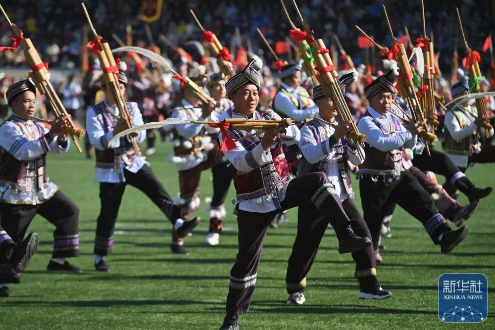 ↑11月29日,表演者在融水县民族体育公园举行的芦笙斗马节开幕式现场表演。新华社记者 黄孝邦 摄