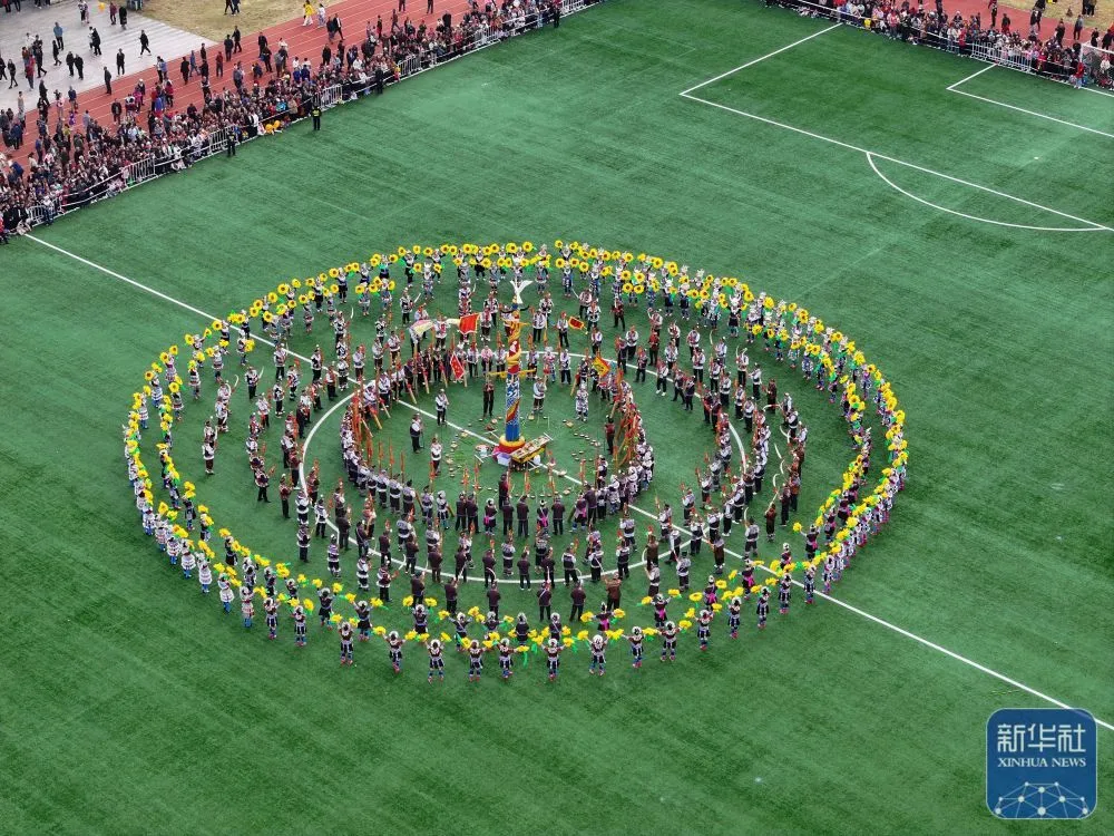 ↑11月29日,表演者在融水县民族体育公园举行的芦笙斗马节开幕式现场表演芦笙踩堂(无人机照片)。新华社发(郑昌昊摄)