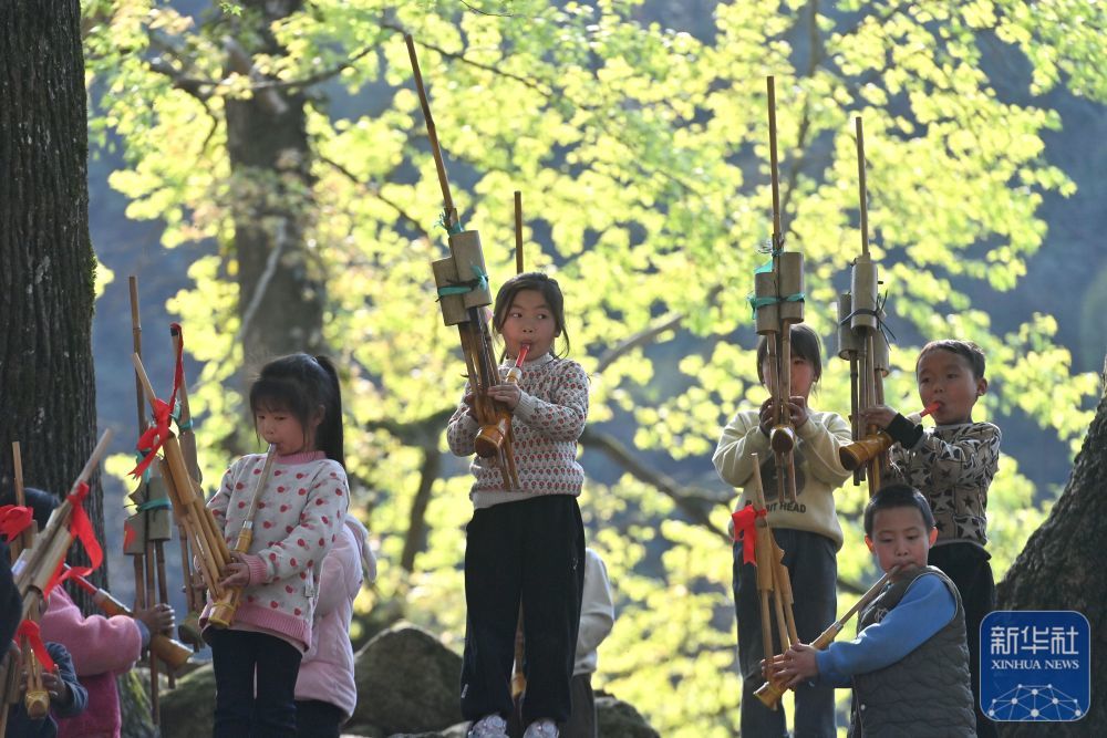 ↑在融水县杆洞乡党鸠村,小朋友在新春民俗活动中吹奏芦笙(2025年1月31日摄)。新华社记者 黄孝邦 摄