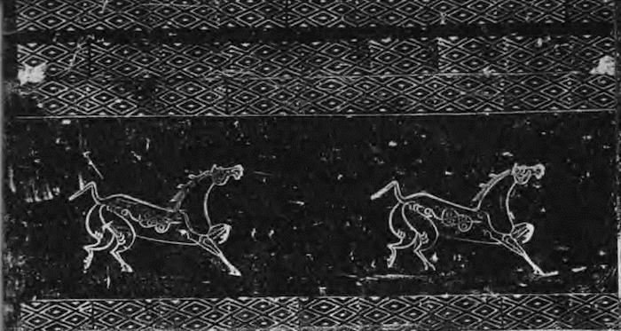 西汉洛阳画像空心砖上,带翼的天马图像相当常见。如洛阳一块画像砖上模印两匹天马,它们一前一后正在飞驰。它们的形态相仿,皆昂首向天,似在萧萧地嘶鸣;颈项长伸,颈背部的鬃毛似剪作三花;肩上两条圆形曲线代表羽翼,尾巴上扬;躯体重心在前半部,右前腿向前迈出落地,左前腿向上半抬,后半身斜向上方,后两蹄尚在腾空,表现出它们急促的飞姿(图12)。