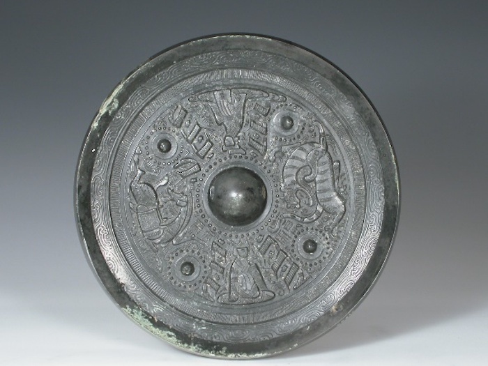 中国国家博物馆藏一面东汉天马白虎神人画像铜镜,直径21厘米,缘厚1.3厘米。镜为圆形,圆钮,圆钮座,环绕一圈连珠纹。镜背由四枚乳钉均分为四区,每枚乳钉纹外又各绕一圈连珠纹。镜背四区的图像隔钮而置,由上而下、自右往左依次为西王母、白虎、东王公和天马。其中西王母头戴高冠、东王公头戴三山冠,两位神人皆着交领长袍,拱手端坐,左右各有三名羽人跽坐俯首而拜。白虎居右,回首咆哮,肩生双翼,尾巴高扬,四足奔腾,气势高昂,其左上角铸两字篆书榜题“白虎”。天马居左,也回首嘶鸣,颈背的鬃毛齐整,马尾上扬,四蹄在奔跃如飞,其右上角铸两字篆书榜题“天马”(图13)。