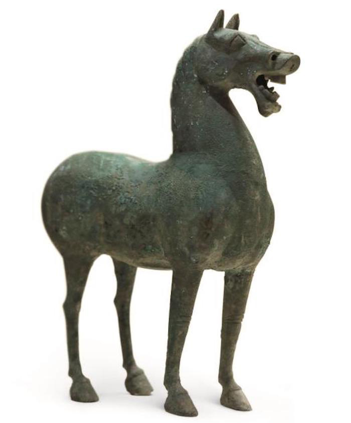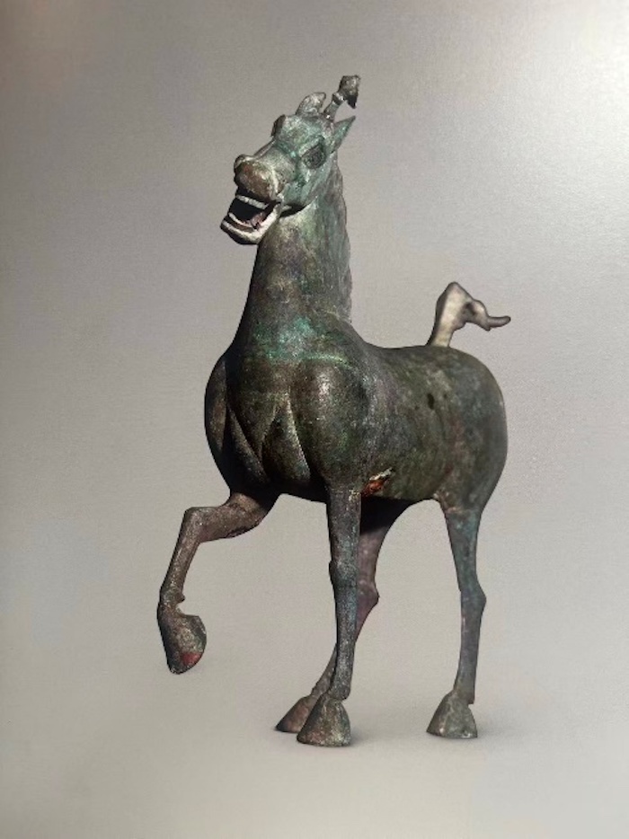 此件青铜驹虽刻画的是小马,不过也能看出它腿短、个头矮,此乃中原本土马的特征。后来马的基因发生改变,得益于西汉武帝自西域引入汗血宝马的举措。