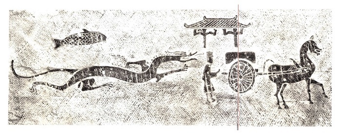 相关图像如四川乐山九峰乡出土一具石棺上,侧面刻辎车和神兽图像。车由一匹翼马所拉动,翼马优游举蹄徐徐而行,羽翼展开,尾巴扬起又垂下;辎车后方游动着一条青龙与一尾鱼,青龙头带角,瞠目,开口吐舌,曲颈,张牙舞爪,龙身修长而蜿蜒;远方还有一座带斗拱的殿堂(图16)。在这块画像石上,天马与青龙相组合在一起,乃天马以“龙为友”的形象展示,显示出浪漫的神话色彩;它们的线条曼妙而流畅,显示出高超的艺术审美力与造型能力。