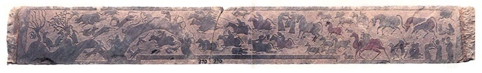陕西绥德中角乡白家山出土一块画像石,石面的画像题材丰富、气势宏大,包括有狩猎、战争、放牧、家居生活等不同场景,展示了东汉社会的多个景象。画面最左方是狩猎图,在连绵起伏的山岭中,一名猎手骑马、两名徒步,追逐着各种动物四处奔逃,所捕获的猎物有野羊、鹿、狐狸、野猪等,天上有飞鸟。其次是战争图像:一支骑兵精锐队伍如雄鹰捕猎一般往前冲刺,气势如虹。队伍前方三名骑兵并驾齐驱正在冲锋,有的弯腰、有的俯身散马蹄,山中埋伏着的敌人正张弓迎面伏击他们。紧随其后的骑兵们勇往直前,有的执弓;有人持钩镶;有的手提一头颅,昂首朝天,十分得意,他的马前倒着被砍下头颅的敌人;有的则抛掷剥下的敌人甲胄欲请功。再次放牧图,最前方两人在马前相对而立,一人递一袋东西给另一人,抬手抚对方的头;另一人低头接物,两个人似在依依送别。随后的马群和羊群簇拥着一匹骆驼,驼峰间坐着两人在放牧,一派悠闲自在状。画面最右端为家居生活图,右上角有一蟾蜍,下有两人对坐玩投掷球类的游戏;右下角有一孕妇执便面,她前面一人躬身俯首捧盘状器、另一人举斧形器与之相对,男女交合,两人厮打,极富有生活气息(图3)。