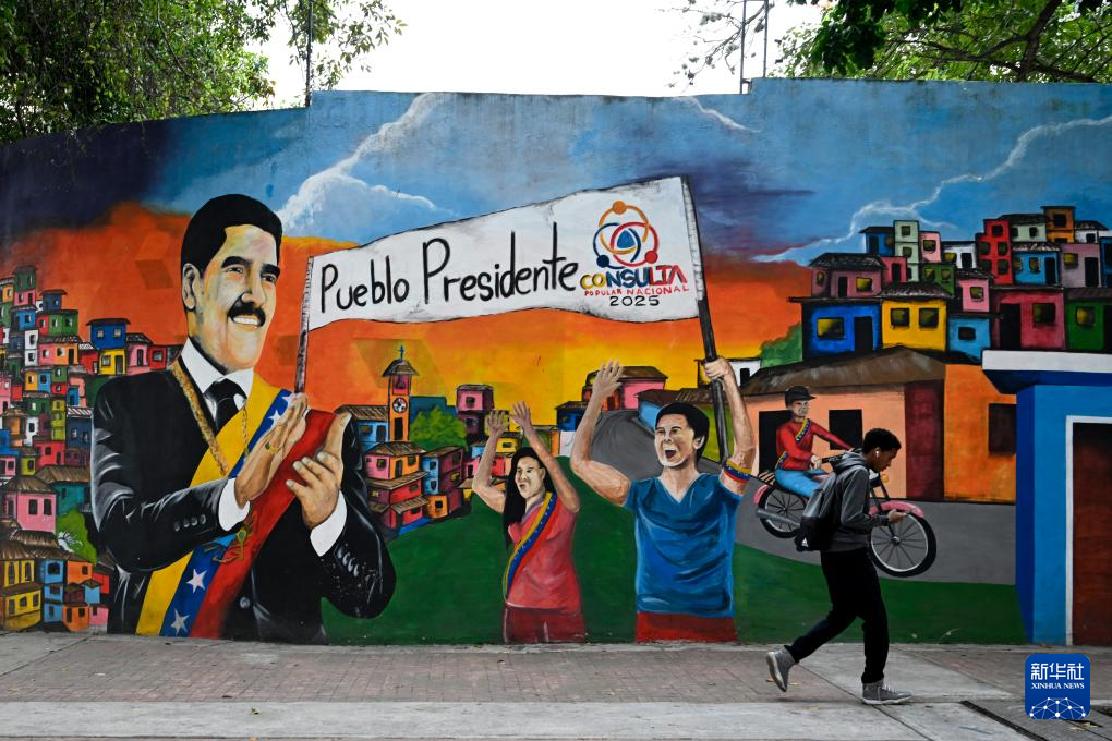 12月2日,在委内瑞拉首都加拉加斯,行人从支持委内瑞拉总统马杜罗的涂鸦墙前走过。新华社记者 李木子 摄