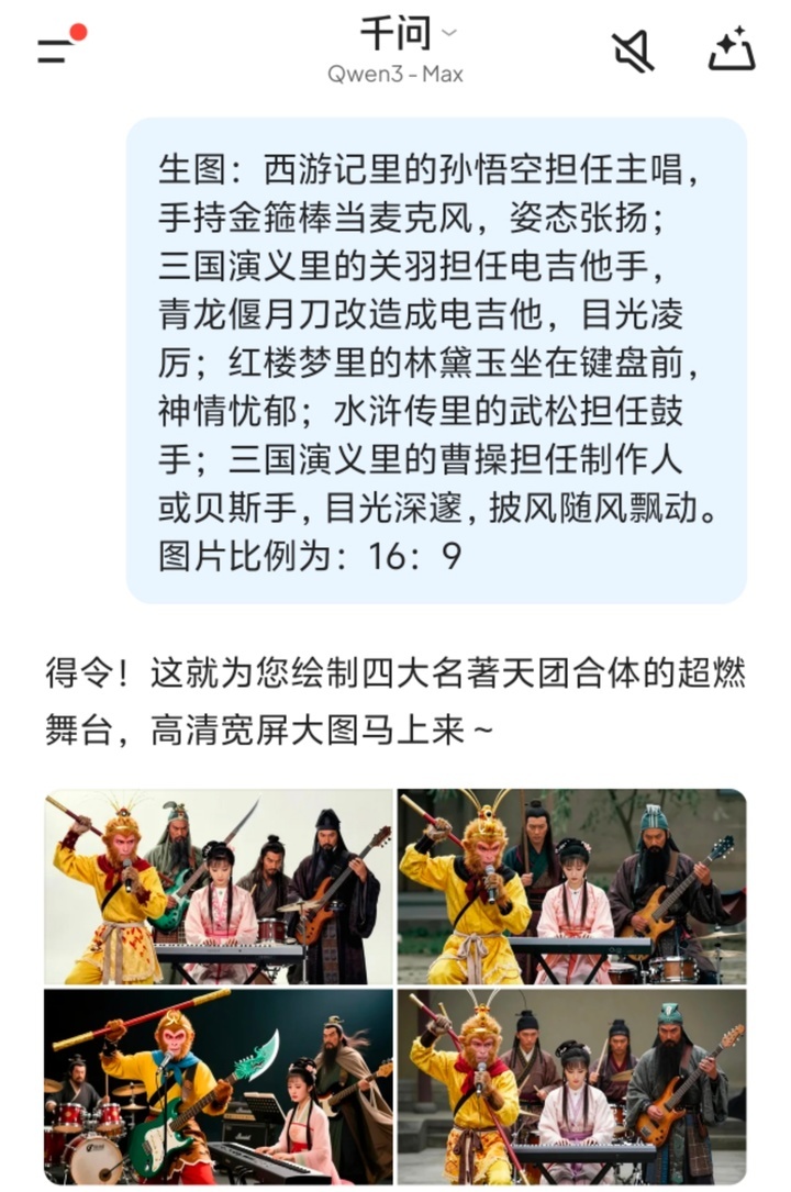 说干就干。我先用千问 App 的图片融合功能, 把五位经典人物 P 成一张站位完美的乐队阵容——