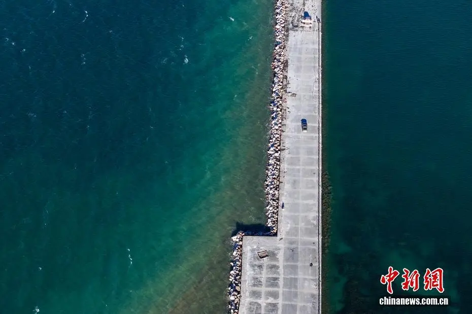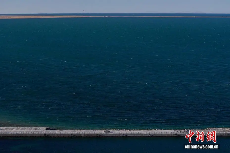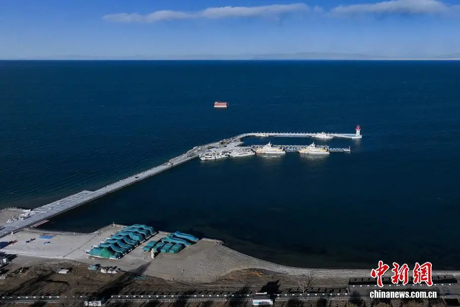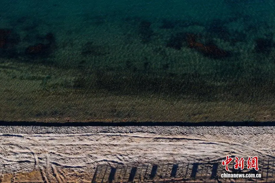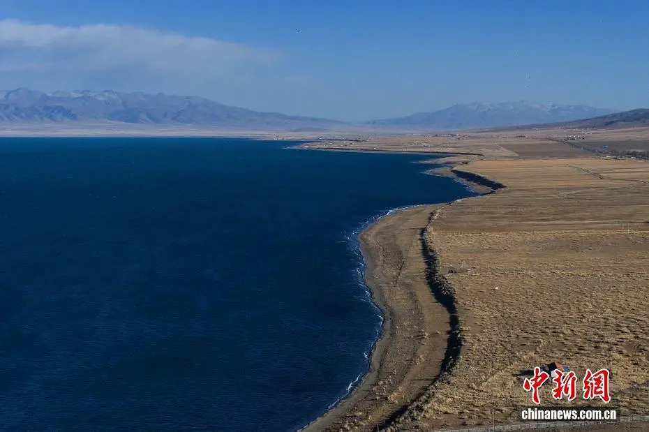 12月2日,青海省海南州,冬日的青海湖二郎剑景区在高原阳光的照射下清澈湛蓝,万物回归静谧之美。图为青海湖一隅。(无人机照片)中新社记者 薛蒂 摄