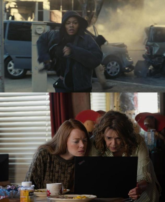 《爱丁顿》女性戏份不多,却发挥关键作用。妻子露易丝传言曾遭左派市长强奸,实际是右派父权的受害者,最后在邪教中找到归属,露易丝就是美国的化身,堪比《一战再战》中的女儿维拉,身怀邪教头子的孩子时,她从过去的神神道道,变成自信的母亲。另一个隐蔽的母权是丈母娘,影片隐晦暗示她知晓丈夫性侵女儿的事实却不作为;她也是权力赢家,丈夫和女婿都是警长,瘫痪后的女婿还当了市长,成为她独享权力的新工具,丈母娘变成垂帘听政的“太后”,把持小镇修建数据中心的决策权。