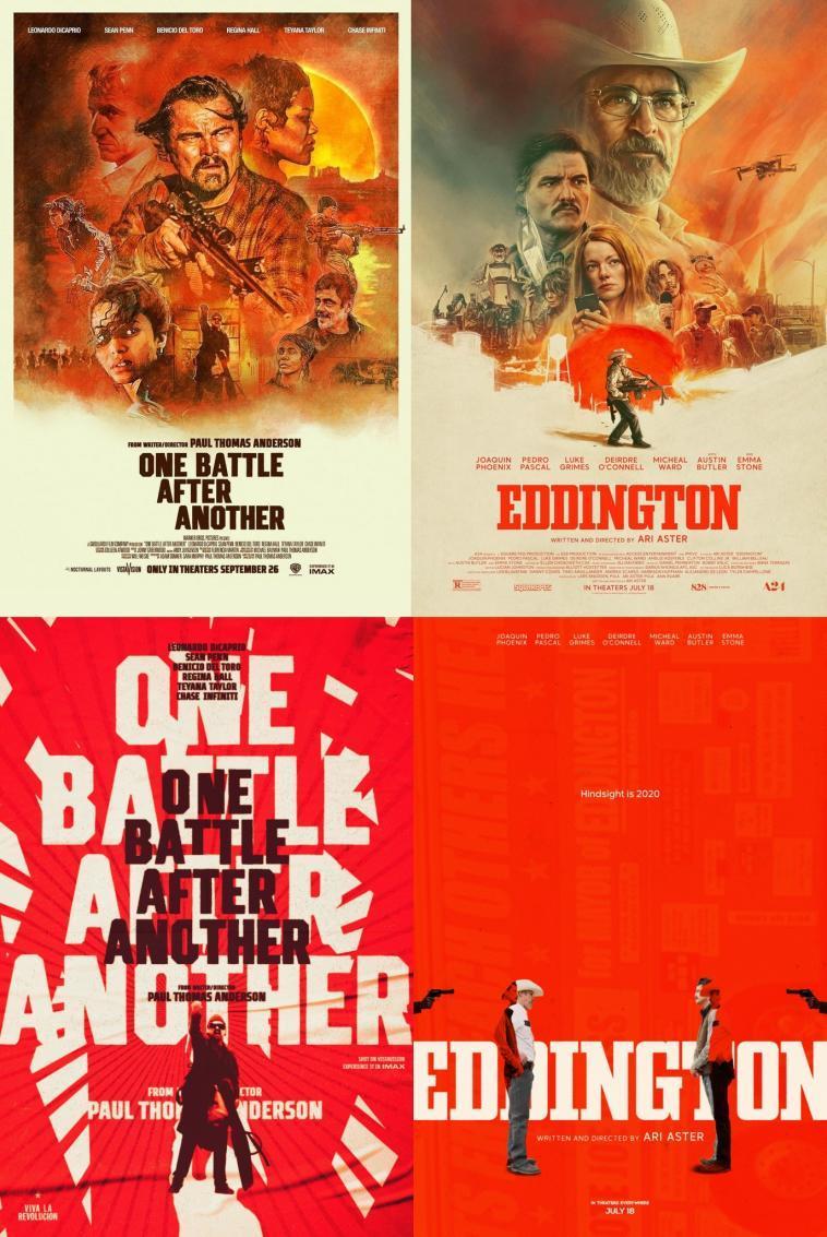 海报“撞脸”的《一战再战》(左侧上下)和《爱丁顿》(右侧上下)