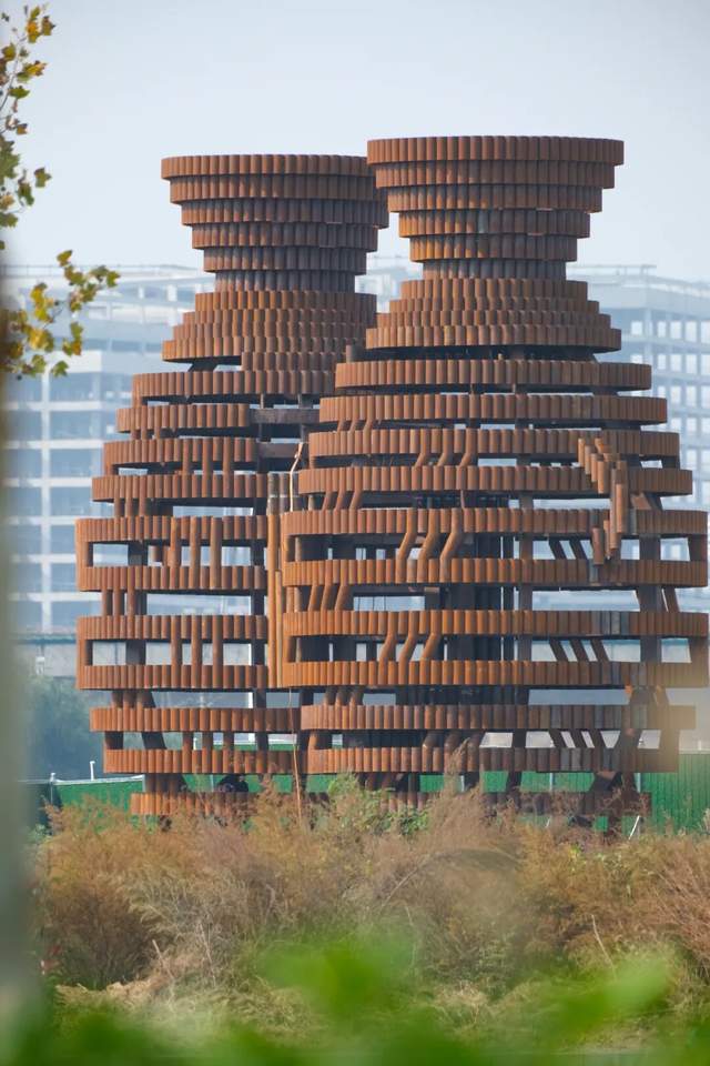 园内设置3大类型共9处景观雕塑,以具象化艺术语言强化空间叙事张力,让游客在观赏中深度沉浸于远古文明的文化肌理。园区南门的“大河·双连壶”,以破土而出的造型再现考古现场风貌,直观传递文物出土的历史厚重感;同处南门区域的“大河·山水共生”传递着千古以来山水格局蕴含的文化脉络与历史讯息,也诉说着雄壮山河滋养下延绵不绝的华夏文明。广场7米高的“大河・彩韵承舟”以遗址代表性文物白衣彩陶盆为原型,传递文明延续的生命力;核心区的“大河・天象赋”则呼应遗址天文元素,生动展现先民对宇宙的早期认知。