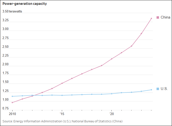 中美两国发电能力对比 《华尔街日报》制图