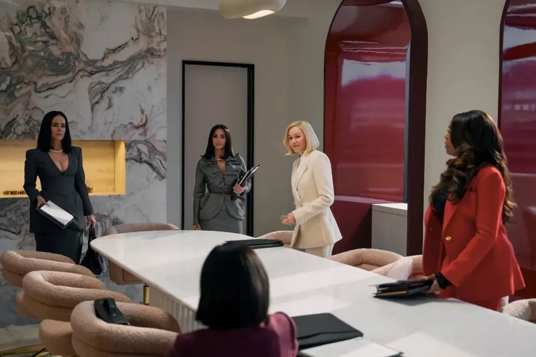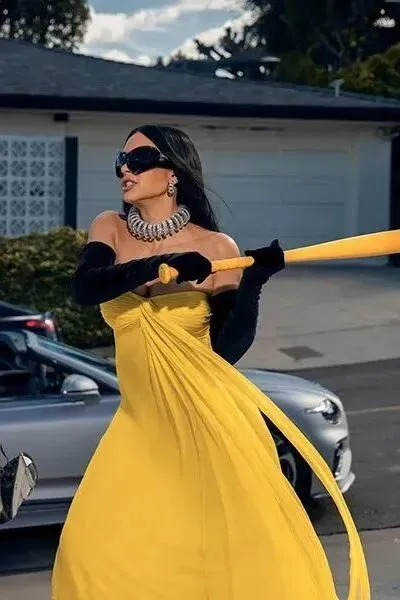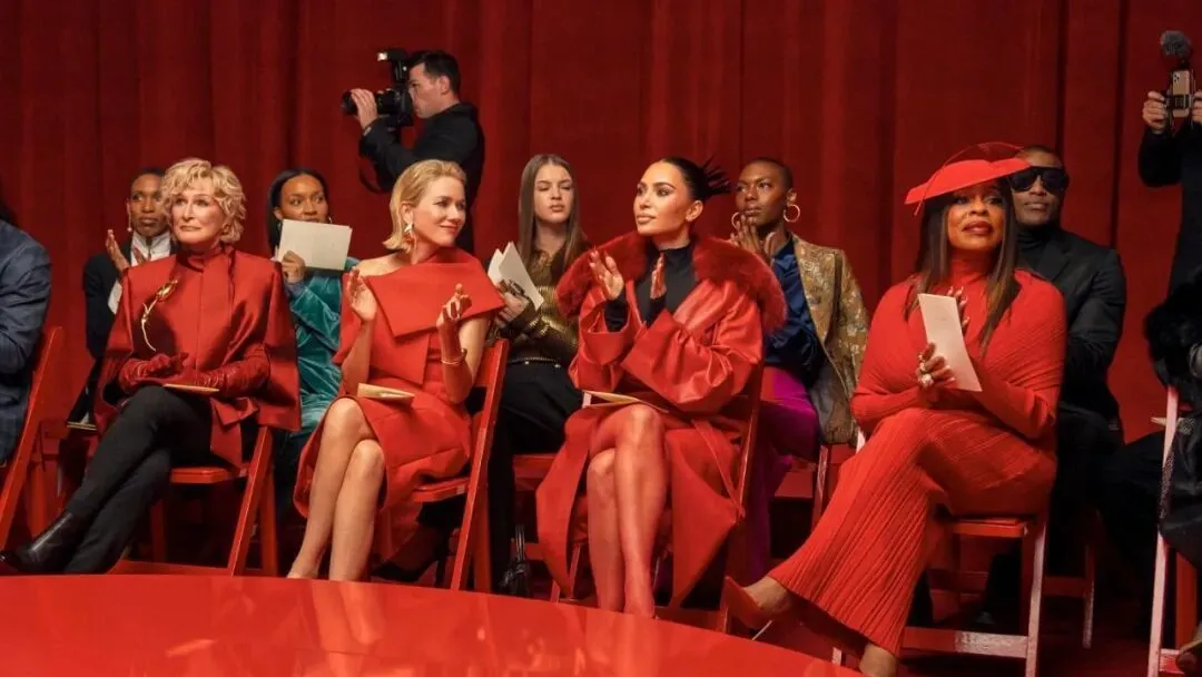客观说一句,Kim演得不行,但穿得确实好看:Valentino亮黄色礼裙致敬Beyonce在《Lemonade》中的砸车名场面;高开衩长裙、亮片大衣、夸张耳饰轮番登场;还有大量强调身体线条与性感力量的“强势办公室套装”Power suit。