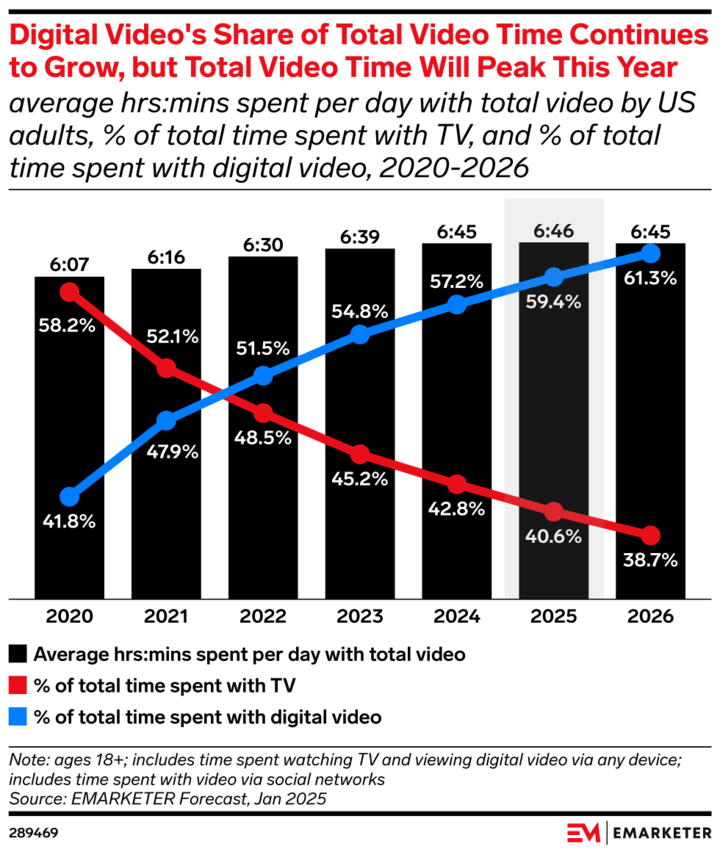 ▲ 2020-2026 年间美国居民在电视和短视频上的使用时长对比。 图片来自:EMARKETER