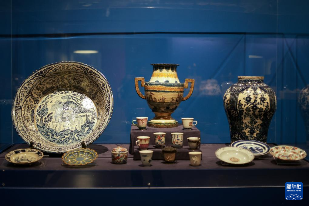这是12月17日在墨西哥首都墨西哥城举行的马尼拉大帆船主题展上拍摄的墨西哥当地陶器和中国明清时期瓷器。新华社记者 李梦馨 摄