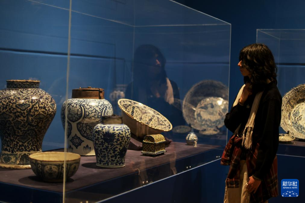 12月17日,在墨西哥首都墨西哥城举行的马尼拉大帆船主题展上,一名女子观看墨西哥当地陶器和中国明清时期瓷器。新华社记者 李梦馨 摄