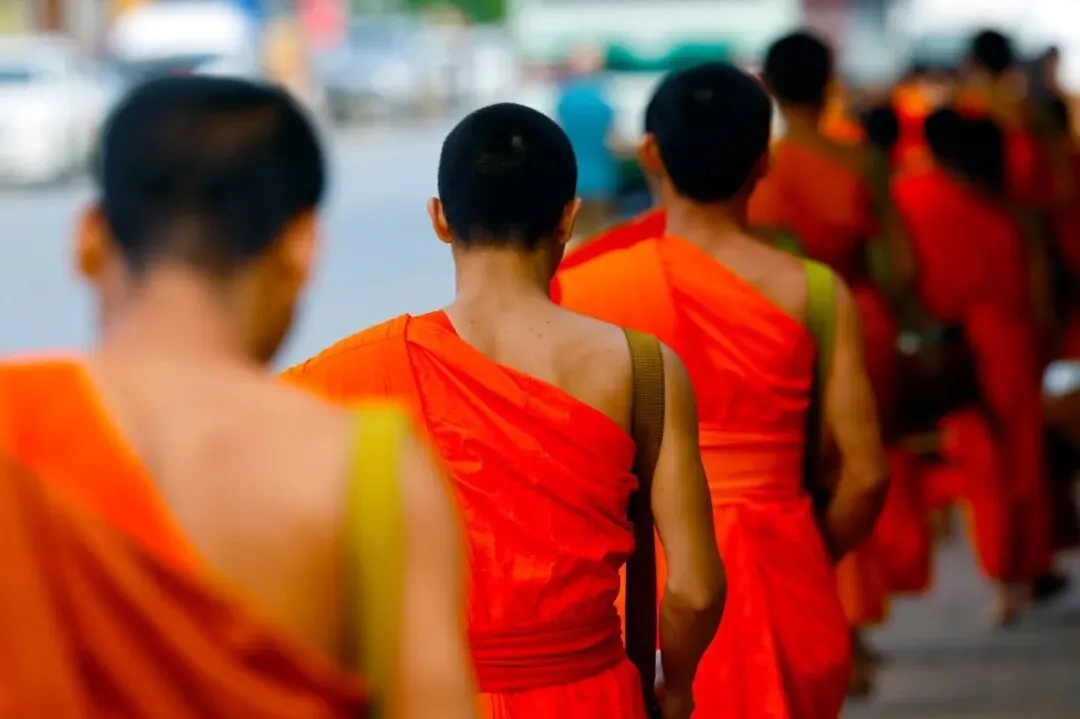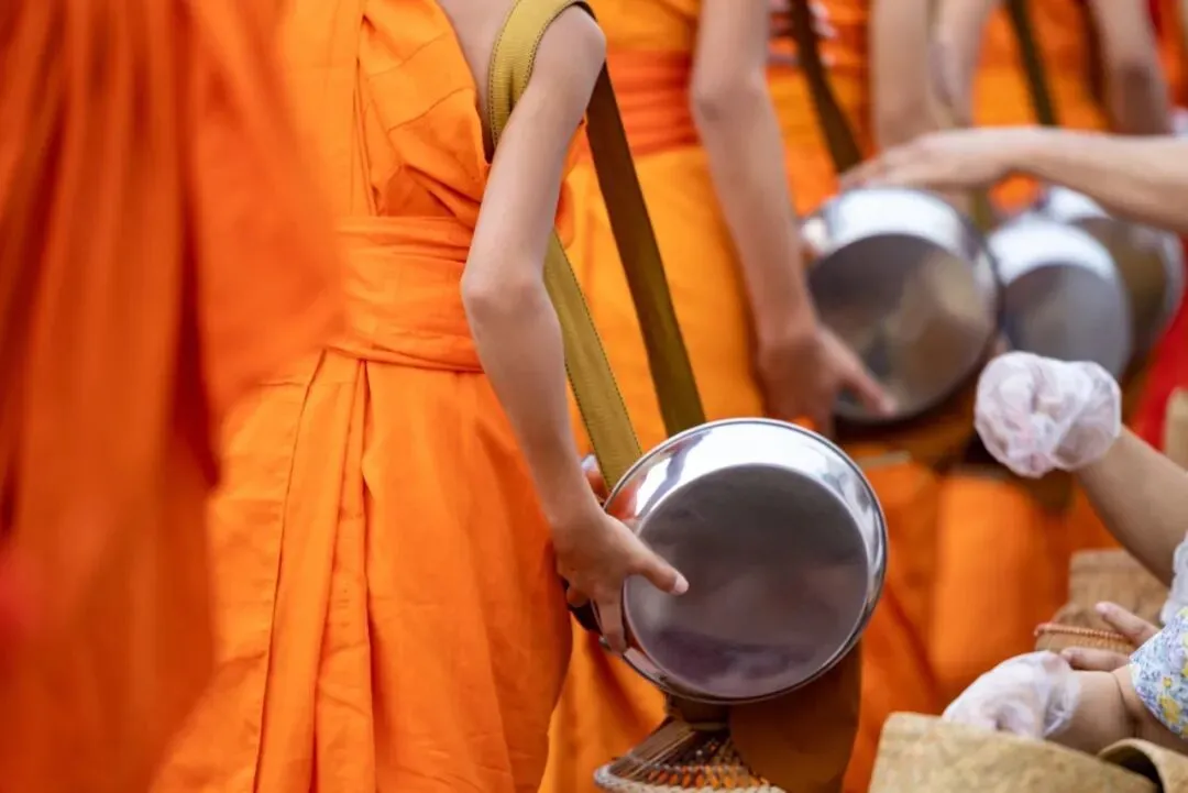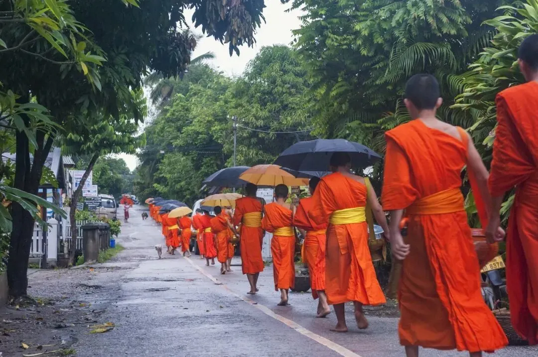 凌晨五点左右,身着橙色僧袍的僧侣们就会托钵出门,沿着路边列队而来。
