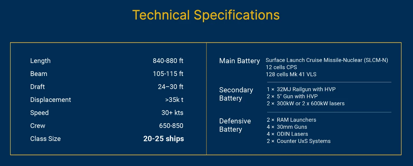 根据USNI News查阅的海军数据,“特朗普”级战列舰将是一艘超过35000吨的战舰,吃水24至30英尺(7.3米到9.14),是1.5万吨的朱姆沃尔特级驱逐舰的两倍多,朱姆沃尔特级驱逐舰是目前舰队中最大的水面战舰。和DDG(X)一样该舰采用柴燃联合动力,但尚不清楚是否沿用DDG(X)同款的罗尔斯罗伊斯MT-30型燃气轮机和整合全电式动力组。舰员员额为650至850人。