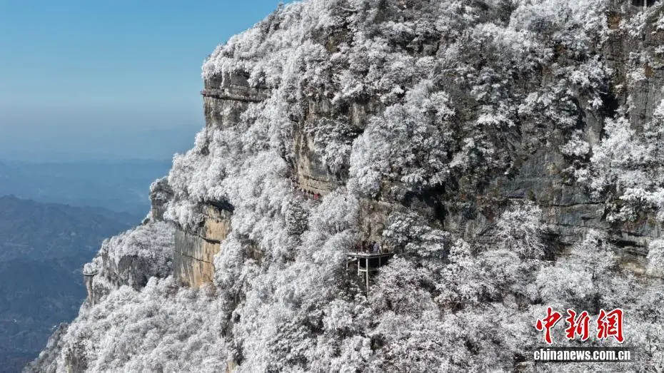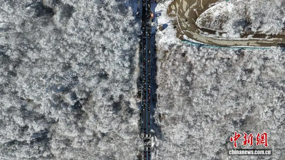 近日,位于川陕交界处的陕西省汉中市龙头山景区冬景迷人,连绵山峦被积雪点缀,蔚为壮观,吸引了不少游客前来登山赏雪。图为游人游览陕西汉中龙头山。宋晓丽 摄