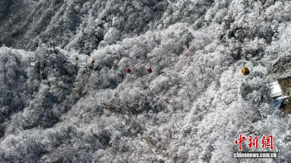 近日,位于川陕交界处的陕西省汉中市龙头山景区冬景迷人,连绵山峦被积雪点缀,蔚为壮观,吸引了不少游客前来登山赏雪。图为缆车穿梭在龙头山中。宋晓丽 摄