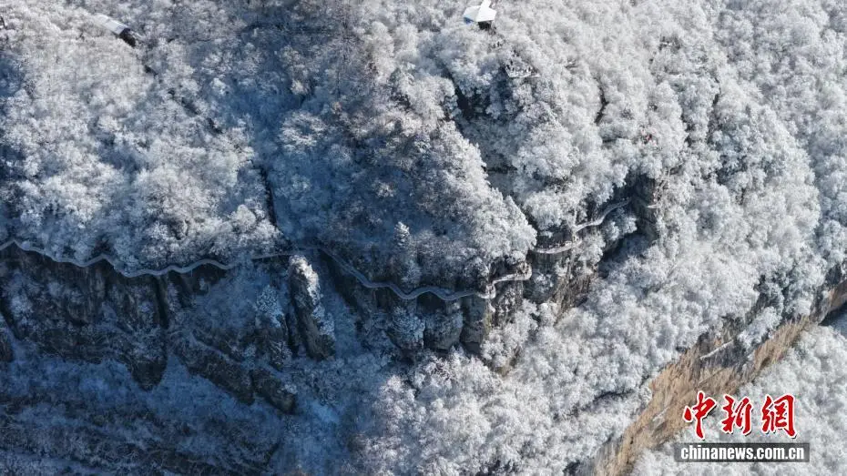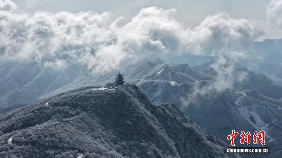 近日,位于川陕交界处的陕西省汉中市龙头山景区冬景迷人,连绵山峦被积雪点缀,蔚为壮观,吸引了不少游客前来登山赏雪。图为龙头山银装素裹。宋晓丽 摄