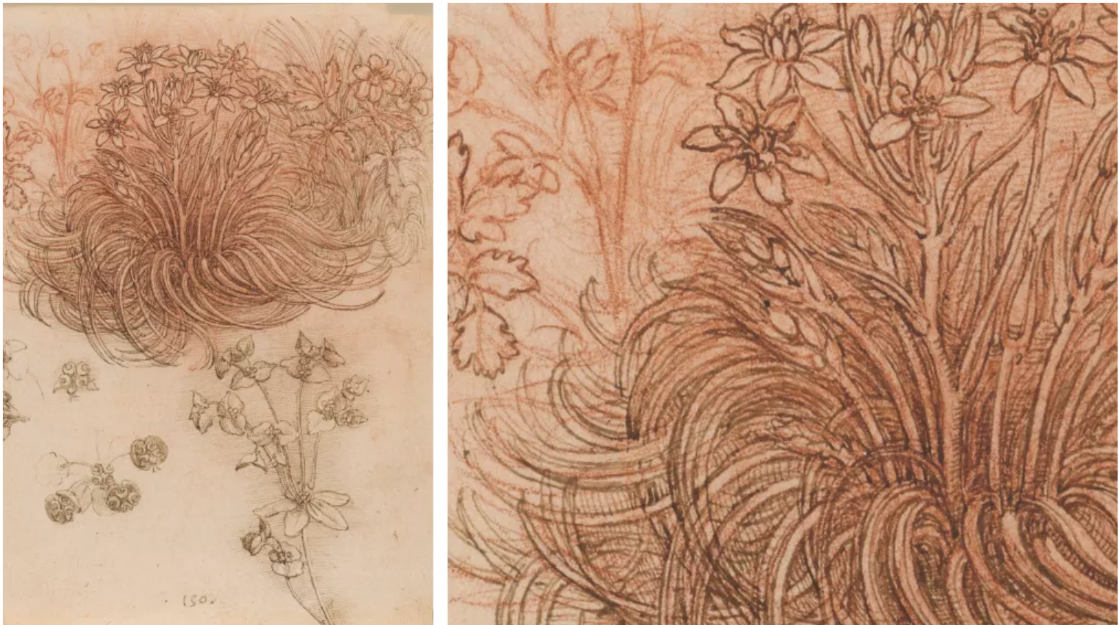 在上面这幅素描中,达·芬奇细致观察了伯利恒之星(学名虎眼万年青)那呈漩涡状舒展的叶片。创作于约1506年至1512年,采用红色粉笔、钢笔及墨水绘制。这是其精美的自然主题素描之一,出现在《跪姿丽达》的预备习作中。尽管带有风格化处理,但背景中形态随意的草叶,暗示列奥纳多是参照实物对这朵花进行了写生研究。