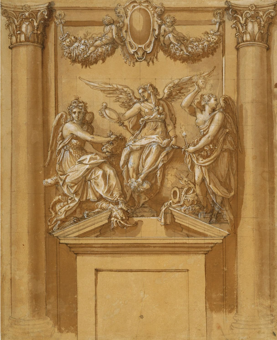 帕萨罗蒂(Passarotti)擅长创作风格奔放且华丽夺目的钢笔画,这幅尺寸较大、绘制精谨的画稿,很可能是他为博洛尼亚的一位收藏家所作。他设计画中人物姿态时,借鉴了雕塑家詹波隆那(Giambologna)创作的一尊河神雕塑——该雕塑是佛罗伦萨波波里花园某喷泉的组成部分。