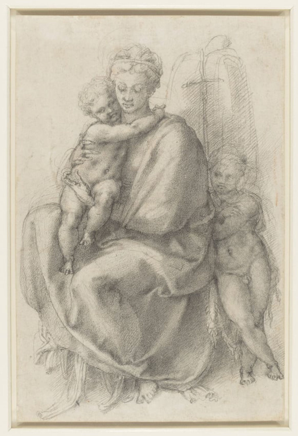 米开朗基罗这幅《圣母子与年轻的施洗者圣约翰》素描大约创作于1532年,创作目的尚无定论。作品中蕴含的厚重质感,以及年轻的施洗者圣约翰十字架后程式化的岩石造型,暗示这可能是一组雕塑的设计草图,或许是为其他艺术家所用。此外,作品的精细完成度也表明它可能是一幅独立创作的素描,或许是出于个人虔诚之心而作。