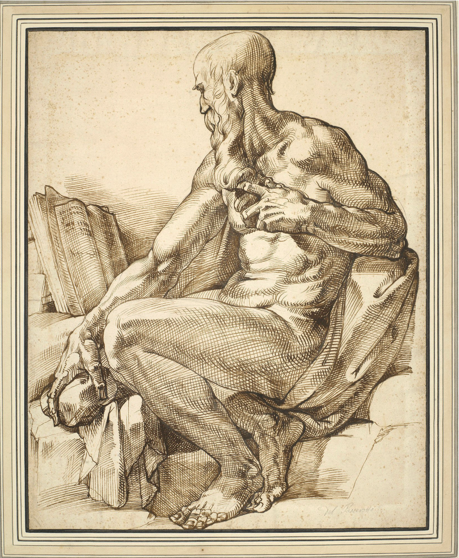 圣哲罗姆是文艺复兴艺术中常见的 “苦修圣徒” 题材,这幅作品通过肌肉线条与神态刻画,突出了圣哲罗姆沉思、内省的状态,是风格主义时期对宗教人物的典型诠释。
