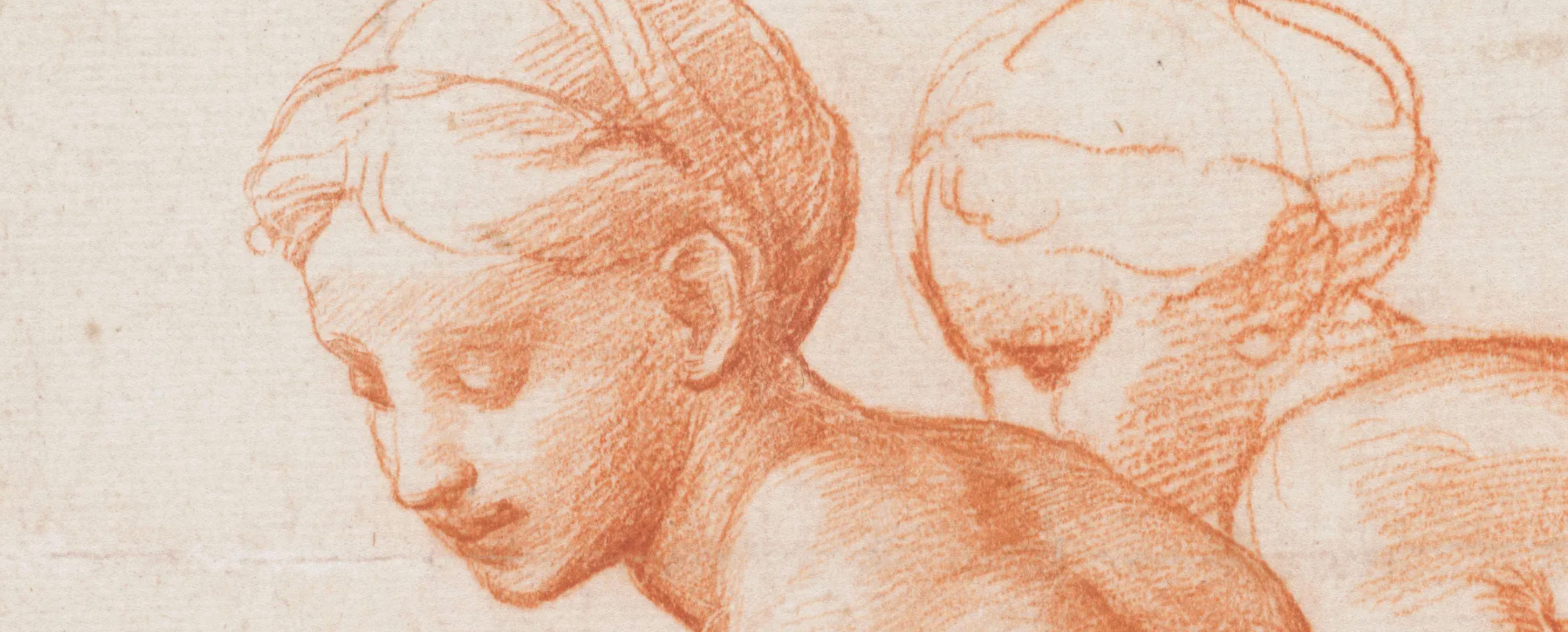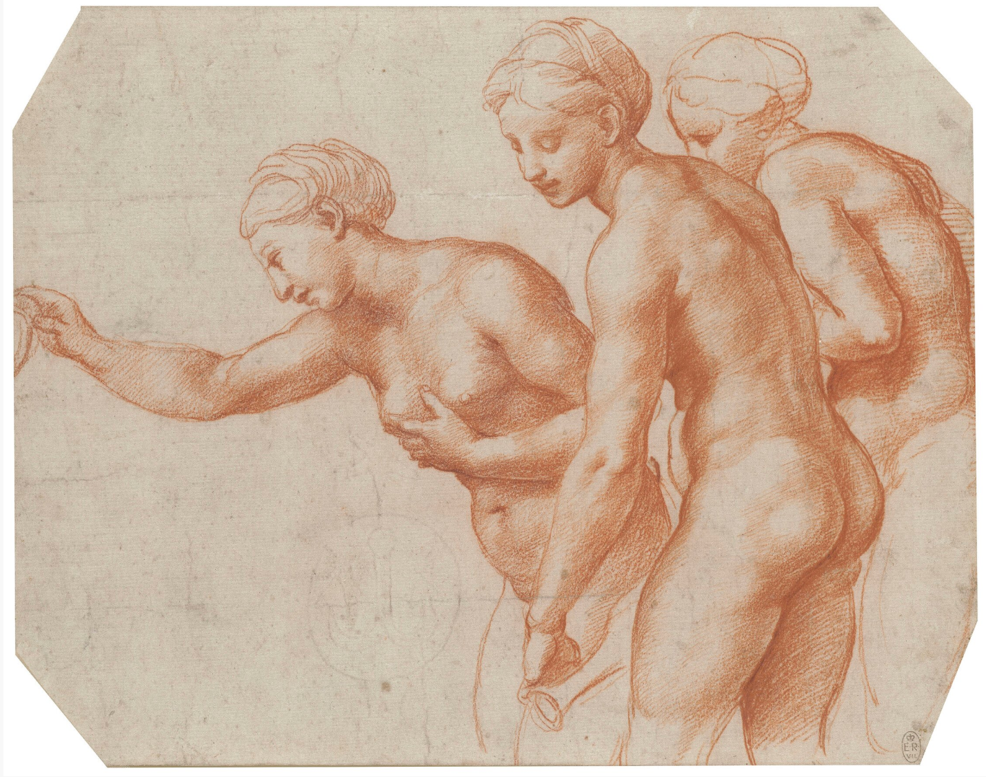 拉斐尔是文艺复兴时期少数采用裸体女性模特写生的艺术家之一——此处,同一模特呈现了三种连续姿态。这幅素描稿是为罗马法尔内西纳别墅湿壁画《丘比特与普赛克的婚宴》中的美惠三女神所作的研究,这三位女神掌管美丽与丰饶。