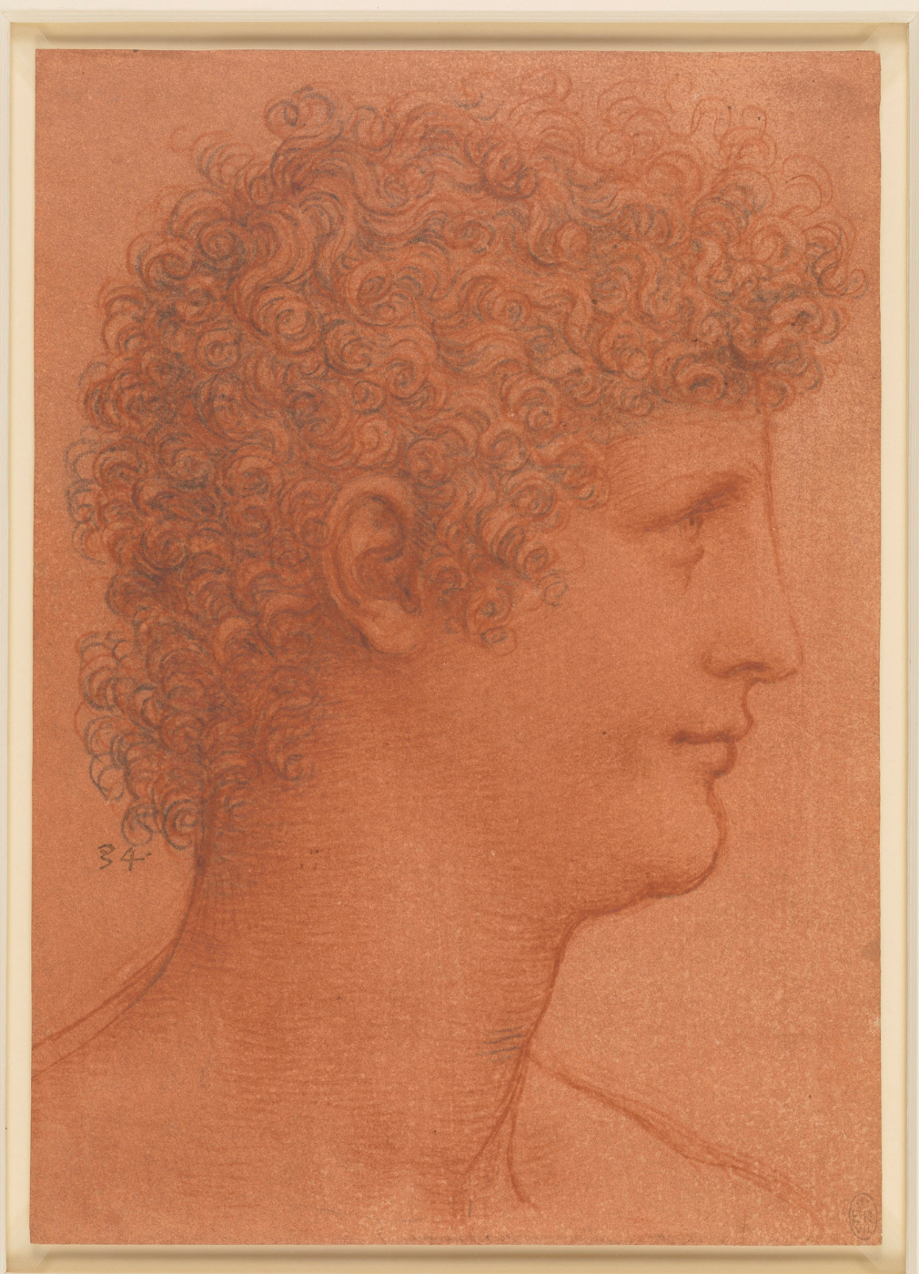 达·芬奇常以绘制虚构头像作为独立作品,聊以自娱。《青年头像》素描纸张所呈现的橙红色调,与画作所用红色粉笔的颜色相近,这在一定程度上弱化了这位理想化青年面部的色调对比。而艺术家为其浓密卷发添加的黑色粉笔,不仅让造型更具立体感,也使画面元素更显丰富。