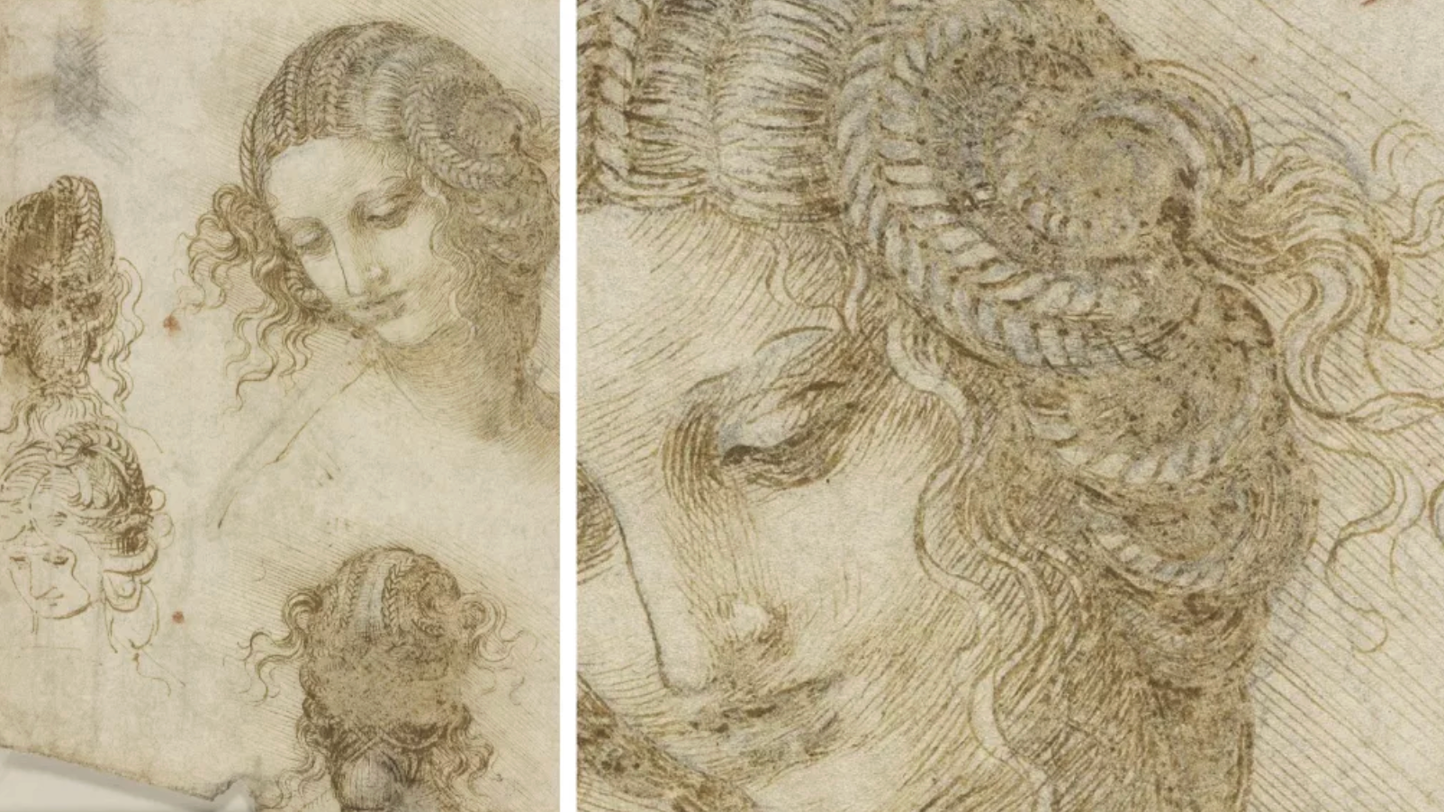 比如这幅勒达头像的习作。达·芬奇创作过《丽达与天鹅》的两种不同构图:一种是勒达呈跪姿,另一种则是站姿。在希腊神话中,主神宙斯化身为天鹅,引诱了斯巴达王后勒达;勒达产下两枚蛋,每枚蛋中都孵化出一对双胞胎。这些作品是达·芬奇已失传的画作《丽达与天鹅》的预备习作。在这幅头部习作里,他并未在勒达低垂的目光上过多着墨,反而将重点放在了她精致复杂的编发造型上。