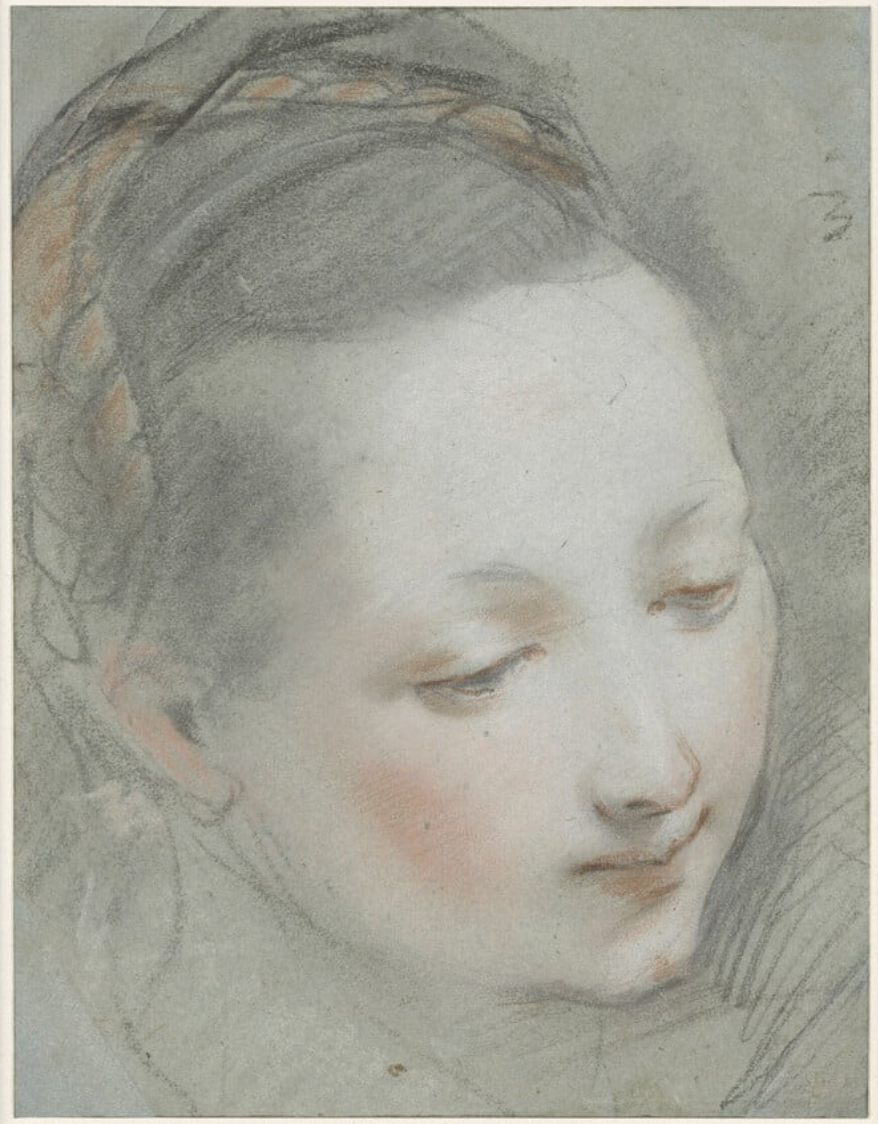 德里科·巴罗奇(Federico Barocci,1535-1612),是意大利文艺复兴晚期至巴洛克早期画家,巴罗奇以细腻的人物刻画著称,这幅《年轻女子的头像》习作展现了他对女性神态与光影质感的精准捕捉,是文艺复兴后期(风格主义阶段)的典型素描作品。