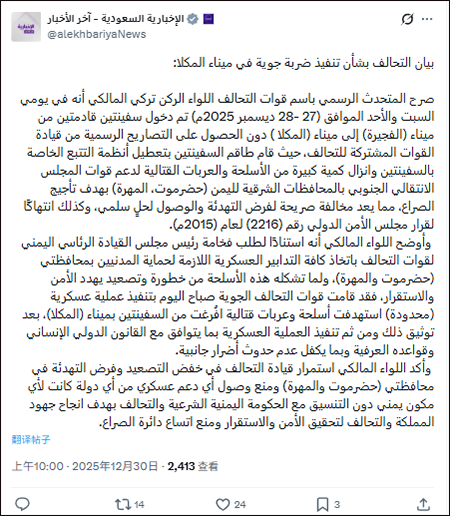 发言人称,应也门总统领导委员会主席的请求,联军已采取一切必要军事措施,以保护哈德拉毛省和迈赫拉省的平民。鉴于这批武器对当地安全稳定构成严重威胁并可能导致局势进一步升级,联军空军于当日(30日)上午在穆卡拉港对已卸载的武器及作战车辆实施了精确的“有限”空袭行动。发言人补充称,行动前所有情况均已得到充分记录,整个军事行动严格遵循国际人道法及相关惯例,最大限度避免附带损害。