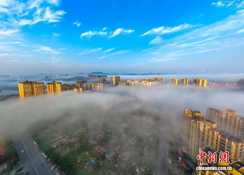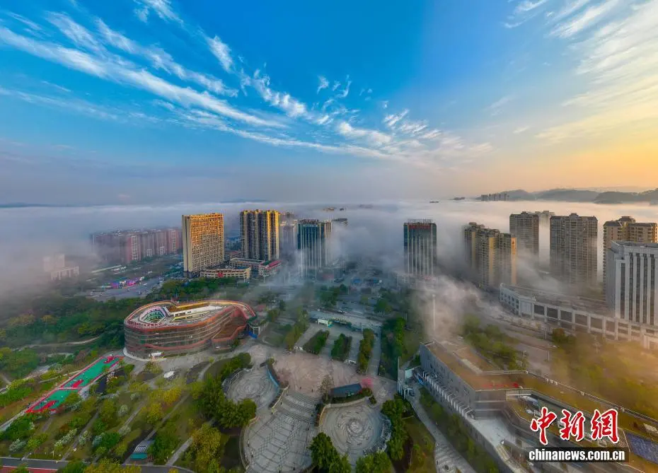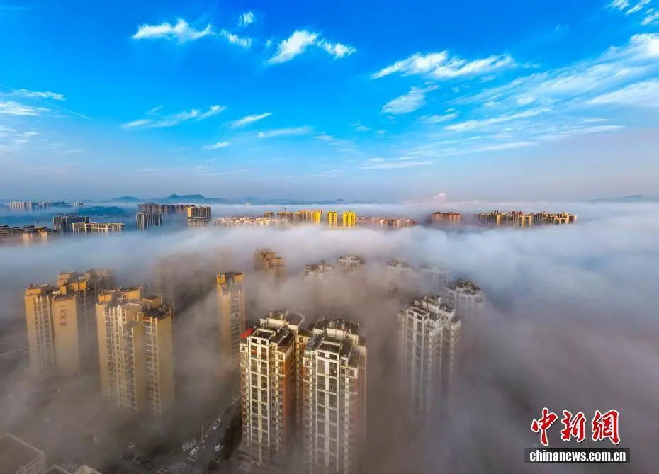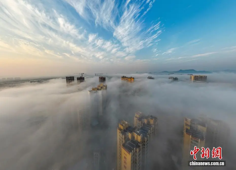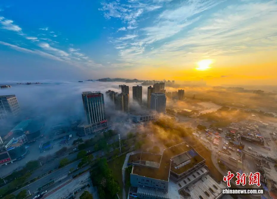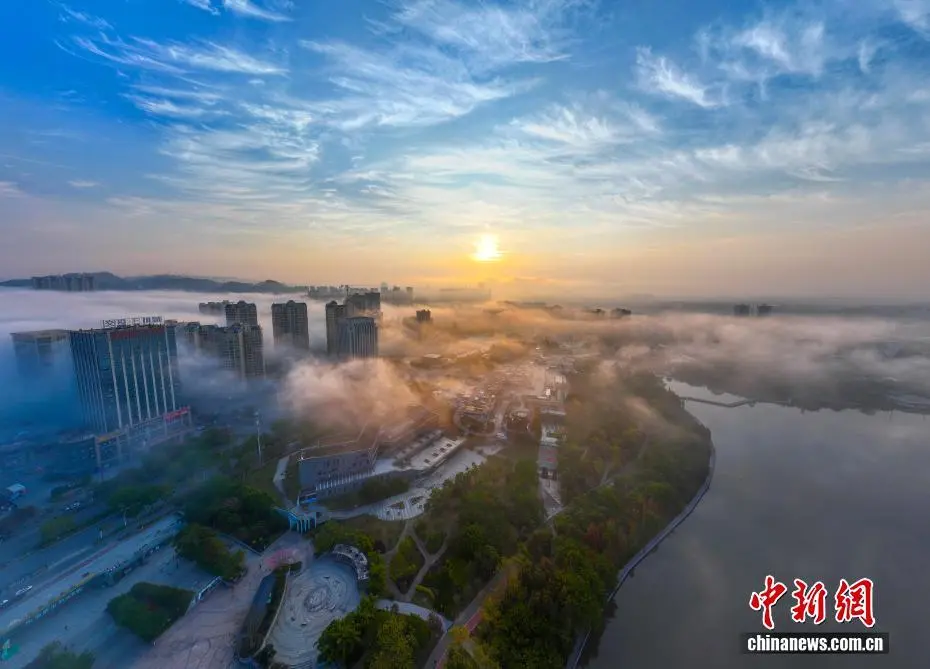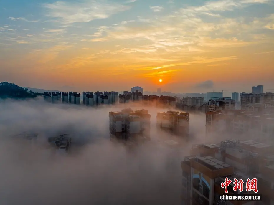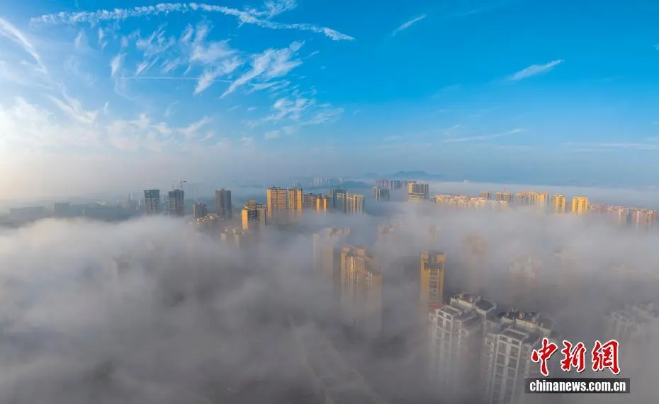 12月30日,广西梧州市城区上空呈现梦幻云雾景观。因近期昼夜温差加大,广西梧州城区上空水汽凝结,层层云雾缭绕山间楼宇,民居在云海中若隐若现,宛如水墨画卷。何华文 摄