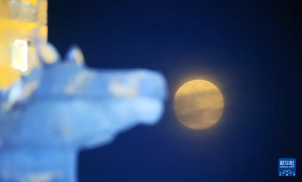 1月3日在黑龙江省哈尔滨市冰雪大世界园区拍摄的月亮。