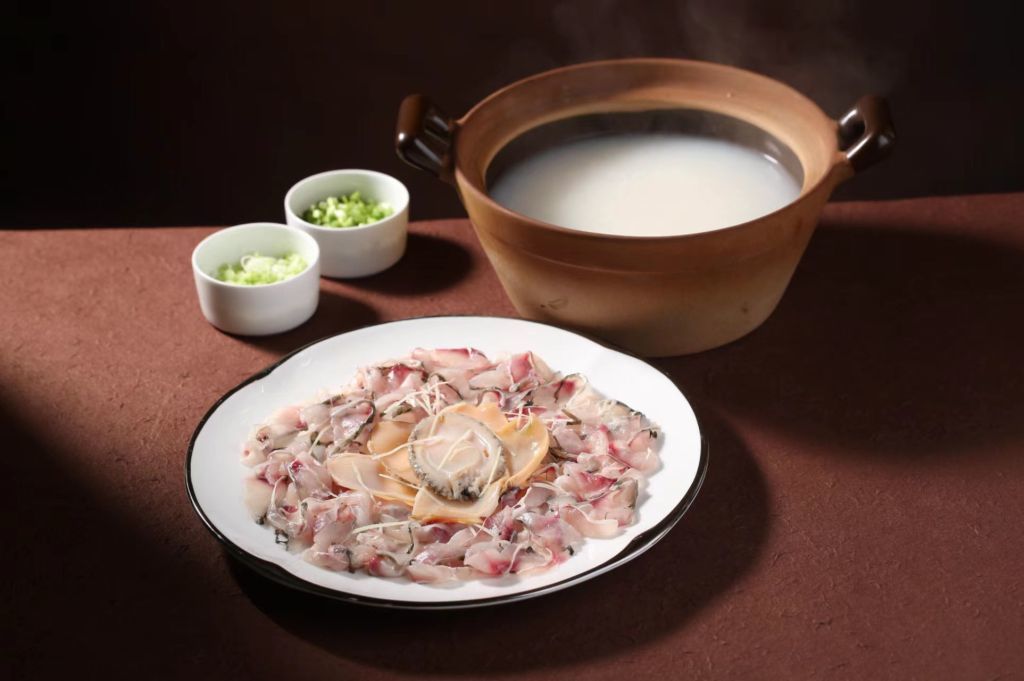 除了丰富的早餐粥,顺德还有席间的拿手“大餐粥”。这类粥的一大代表就是顺德出名的鱼生宴上的压轴收尾环节“鱼生粥”,顺德鱼生宴有“一鱼五吃、六吃”之说(鱼片生吃,鱼皮凉拌,鱼骨、鱼头煎或蒸,鱼肠炒蛋,鱼腩煲粥),其中“粥”是收尾的最后一吃。这个粥是顺德鱼生宴不可或缺的主体,也是先熬制好粥体,然后待前面几吃完成后,吩咐上粥,这时厨房将切配鱼生时的辅材鱼腩放入粥体生滚,最后放入生菜丝或菜心粒上席。因为鱼生粥是顺德鱼生宴的收尾配角(鱼生是主角),由此,这款粥也就没有强调太多的特色,是常态序列。