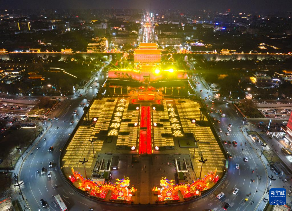 1月4日拍摄的西安城墙南门“长安灯会”景色(无人机照片)。