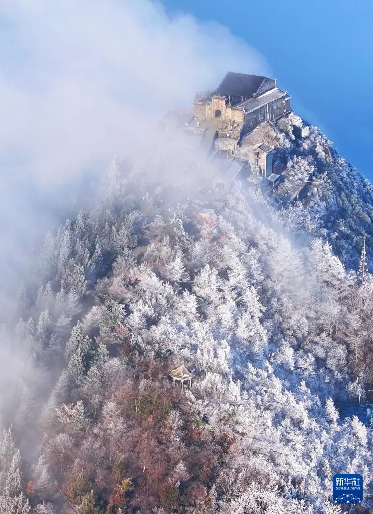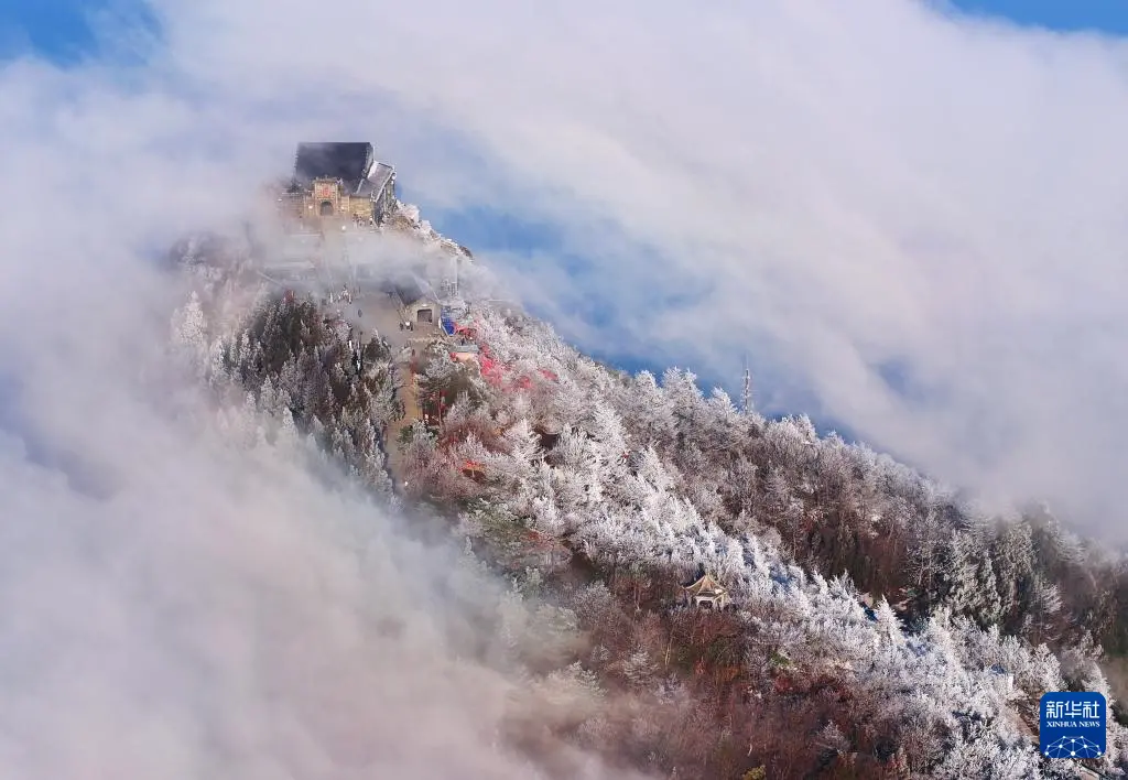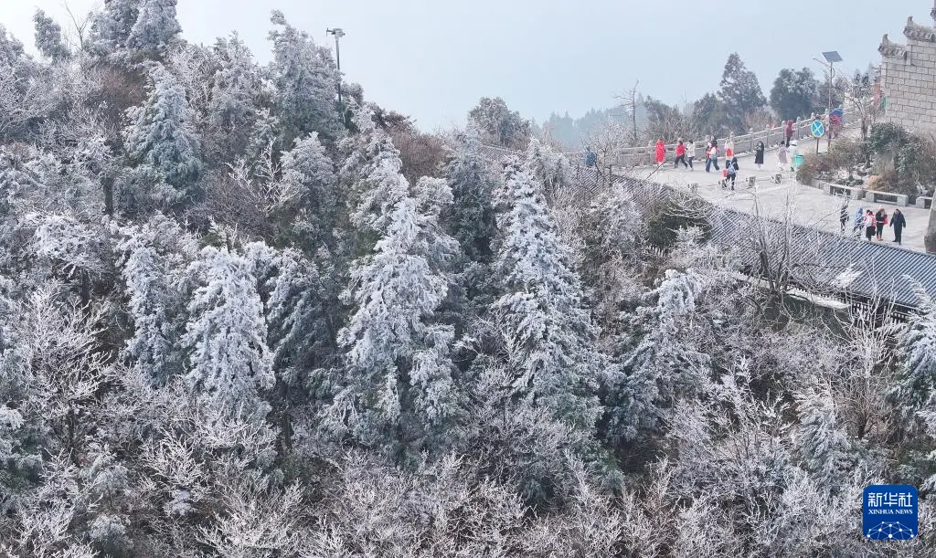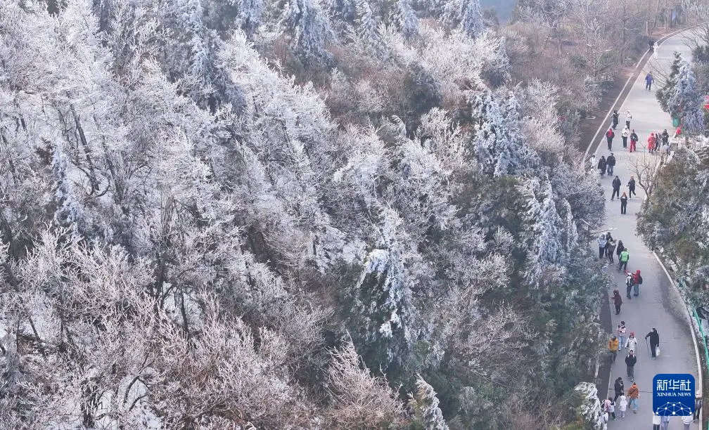 连日来,湖南省衡阳市南岳衡山风景区出现雾凇云海景观,壮美如画的景色吸引众多游客前来观赏游玩。