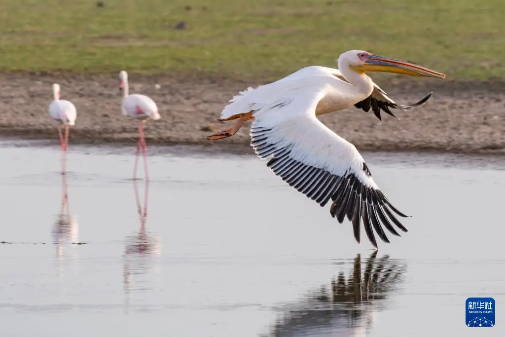 1月8日,在肯尼亚安博塞利国家公园,一只鹈鹕低空飞过两只火烈鸟。