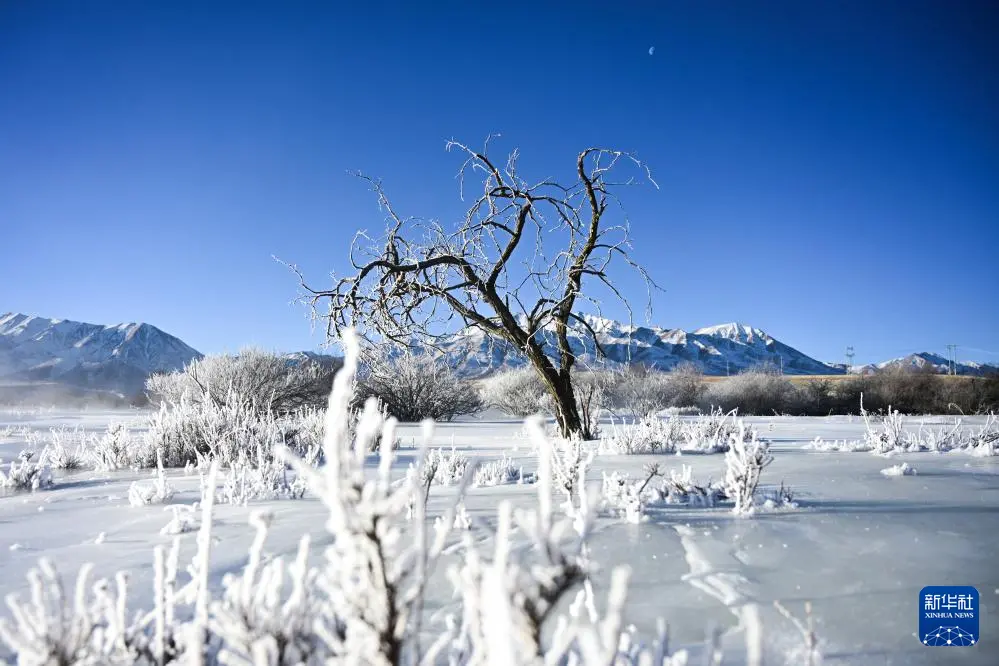 冬日时节,青海省海北藏族自治州祁连县出现雾凇景观,与祁连山的日出相映成趣,美如画卷。